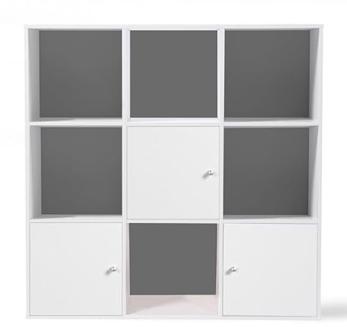 IDMarket – Mueble de almacenamiento cubo Rudy 9 cajas madera blanca con 3 puertas fondo gris